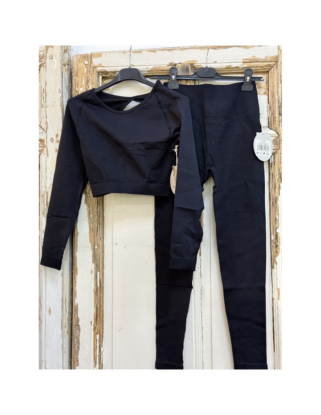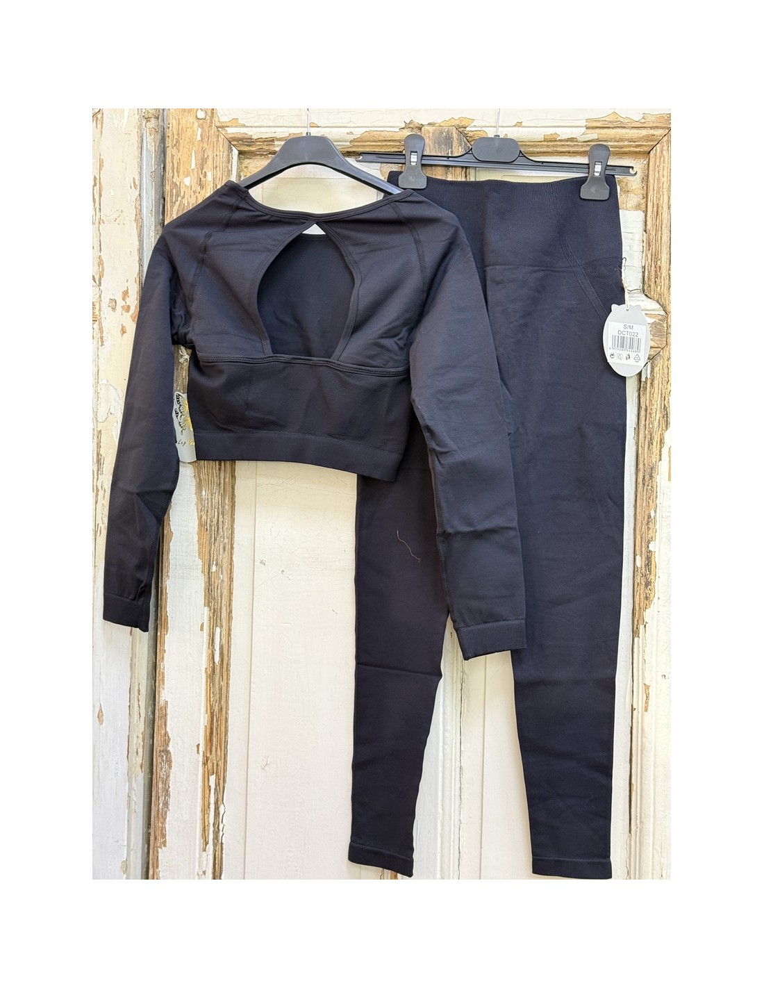 conjunto deportivo de dos piezas, malla de tiro alto con top de manga larga, con apertura en la espalda.